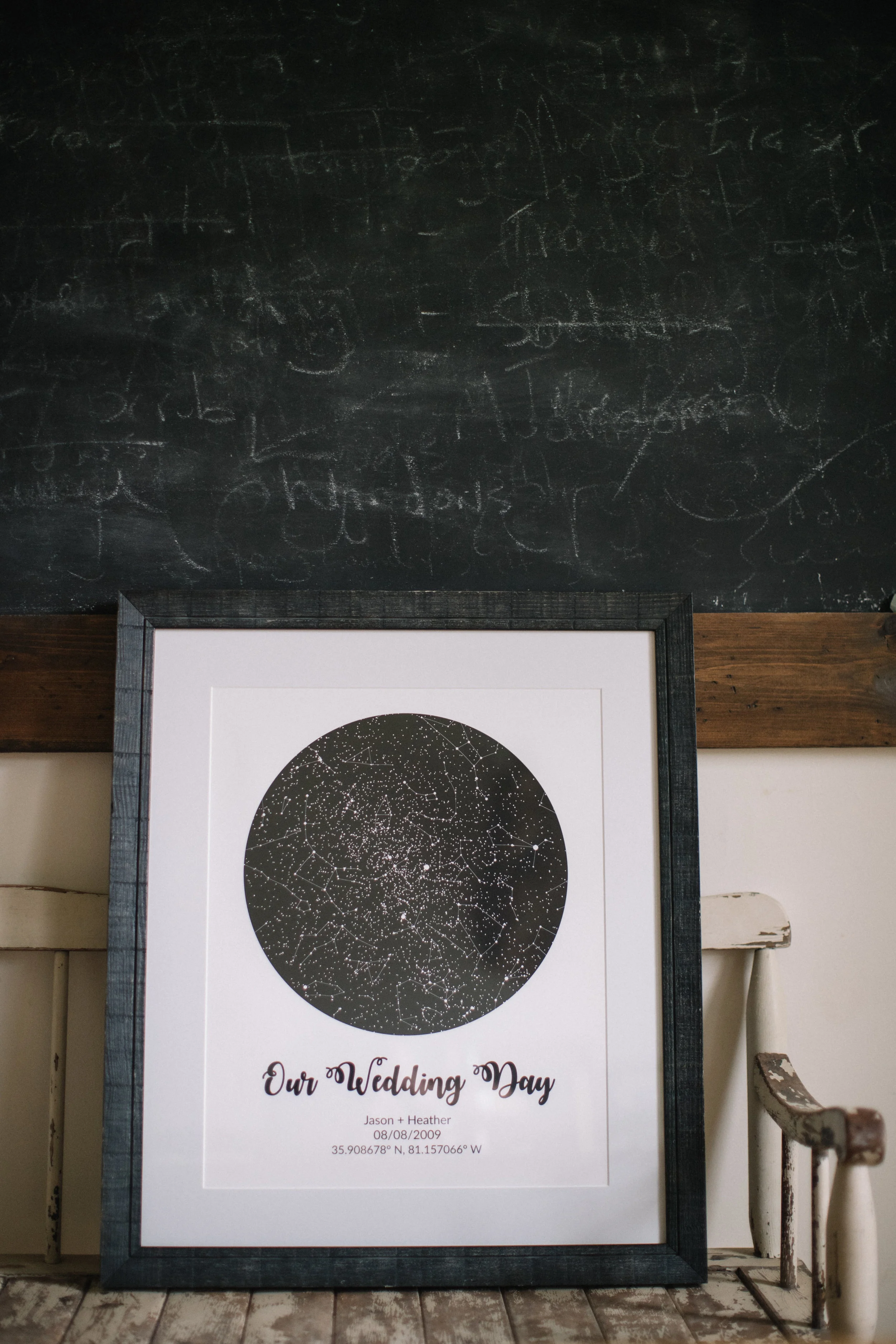 This is a customized Star Map that shows what the night sky looked like at an exact time and place in history. We gave them the coordinates of where our wedding took place, and the date and they created this map for us. Pretty neat!
